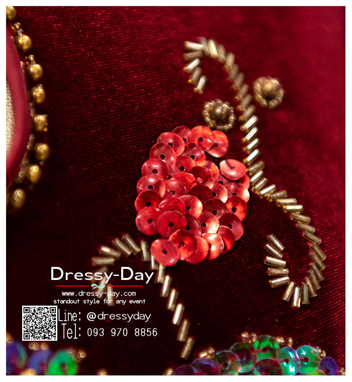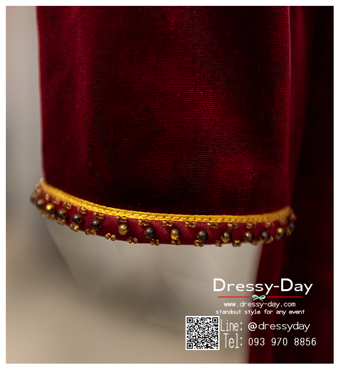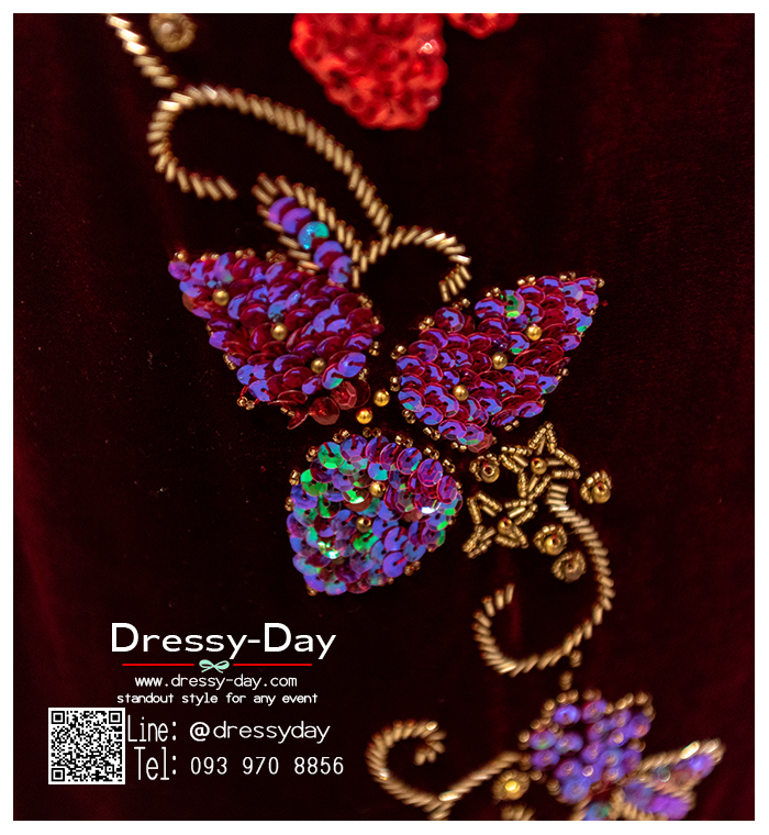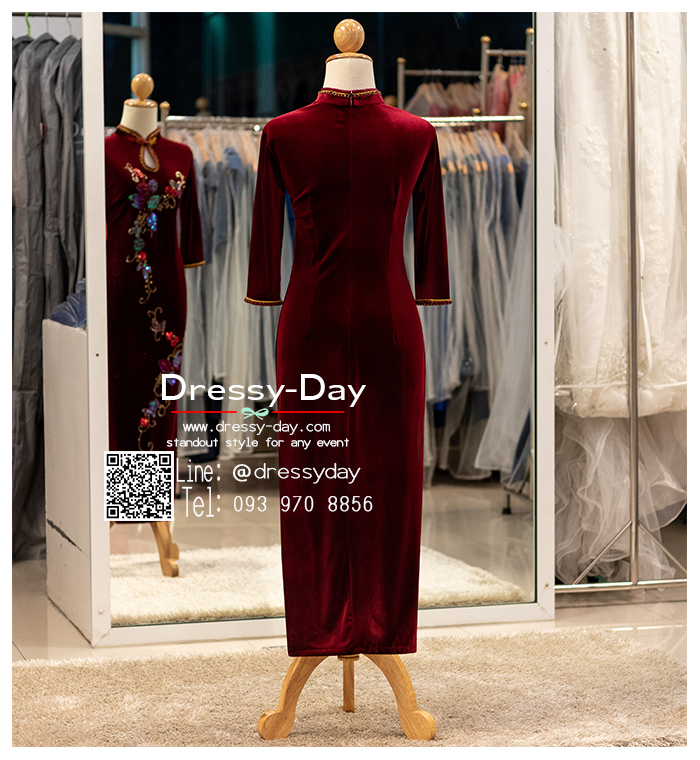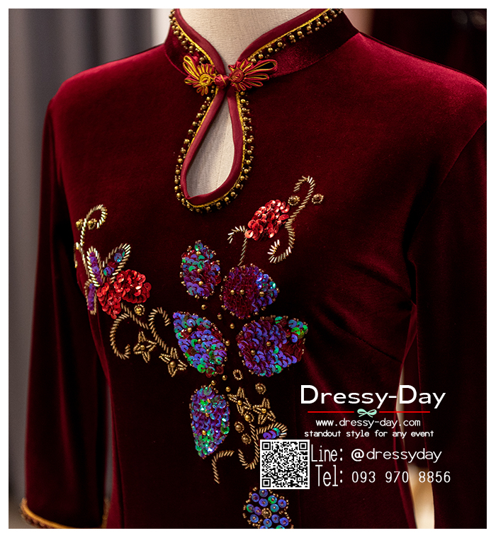 - ดีเทลของ ชุดกี่เพ้าสวยๆ : ชุดกี่เพ้ายาวสีแดง เบอร์กันดี มีแขน ผ้ากำมะหยี่พรีเมี่ยม ปักเลื่อมลายดอกเหมย กระโปรงผ่าด้านข้าง ใส่แล้วสวย ผอม หรูหราแบบจัดเต็ม