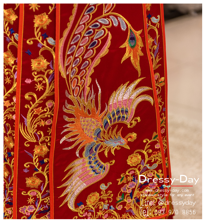 - ชุดแต่งงานจีนโบราณตามประเพณี รุ่นนี้เนื้อผ้าหรูหรา อลังมากค่ะ เป็นงานปักดิ้นและไหมลายหงษ์ทั้งชุด ทั้งด้านหน้าและด้านหลัง ใส่แล้ว สวย หรู อลังการแบบจัดเต็ม