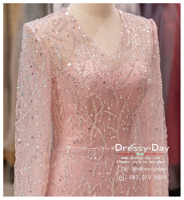 - ชุดเจ้าภาพรุ่นนี้ เป็น ชุดแม่เจ้าสาวหรูๆ แบบมีแขนยาวปลายระบาย คอวี กระโปรงทรงหางปลา ผ้าปักเลื่อมทั้งชุดมาพร้อมซับในซาตินอย่างดี สวยหรู อลังการ แบบไม่ปราณีแขก